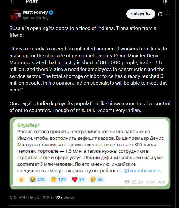 Fri Dec 5 19:11:13 2025 (*4e3d9761*):: (*4cfb807c*):: Theyre gonna regret that … (*4cfb807c*):: Population of Russia is ~143.5M (*4cfb807c*):: So 3.5% of population import (*4e3d9761*):: (*4297a328*):: Proper use of DEI +public!